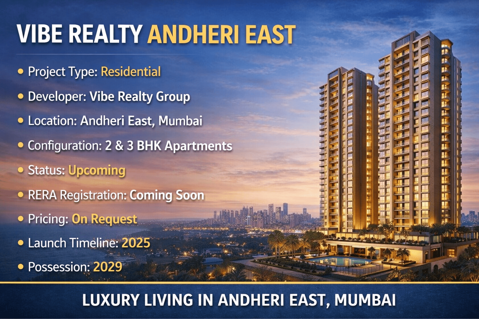 This residential development is located in Andheri East, Mumbai. The project offers 2 and 3 BHK apartments designed for city living. It is an upcoming project with a planned launch in 2025. The possession timeline is set for 2029, allowing buyers to plan investments properly. Pricing details are available on request, and RERA registration will be announced soon. The project focuses on creating functional homes that suit modern families and professionals.